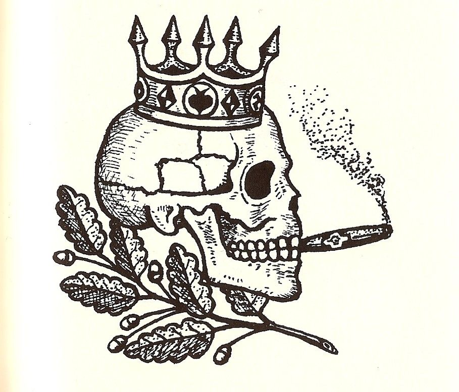 Kirok shouldered Ana aside as he stomped into the room, shotgun loaded and pointed to the floor, bayonet stuck to the end like the spear of an angry god, his armor fitted with heavy durasteel plating for close-quarters combat, a surly expression in his terrible yellow eyes. Interestingly, there was a new decoration on his armor, a black-line logo on his left shoulder - a crowned skull on a bed of laurels, smoking a cigar.