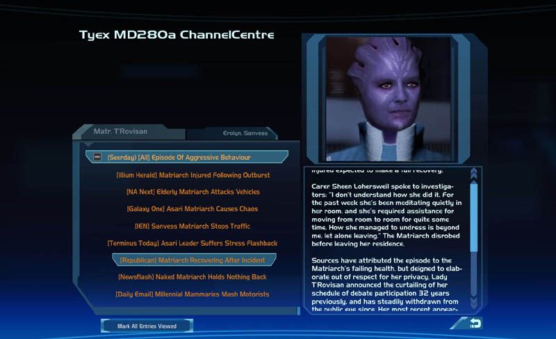 Erolyn, SANVESS - An elderly asari was arrested after leaving her residence nude, walking into traffic, and overthrowing every vehicle in a ten-yard radius. Aunitha T’Rovisan, 1182, has been a Matriarch for the past four centuries. Once a formidable biotic commander, time has quietly been taking its toll on her, as she has been shrinking out of the political eye for the past 32 years. Since the end of the Reaper War, she has been taking up residence in an assisted living home. This changed, however, in a matter of minutes last night. “I don’t understand how she did it,” said 216-year-old Sheen Lohersweil, who has been caring for the old Matriarch since she arrived at the home. “For the past week, she’s been meditating quietly in her room, and she’s required assistance for moving from room to room for quite some time. How she managed to undress is beyond me, let alone leaving.” The Matriarch’s outburst has caused several thousand credits’ worth of damage, not including the hospitalization of three asari with cracked ribs and head injuries. She was subdued after two huntresses were deployed, incapacitating the woman through their combined biotics. She is being treated for her injuries at an undisclosed location. Presslink News Aggregator: Collecting headlines from across the galaxy. ((Official administration news feed. Please consult the Site Rules for submitting an article.)) |
