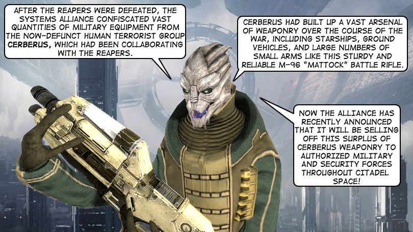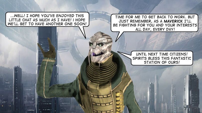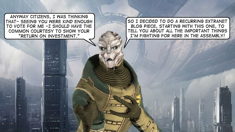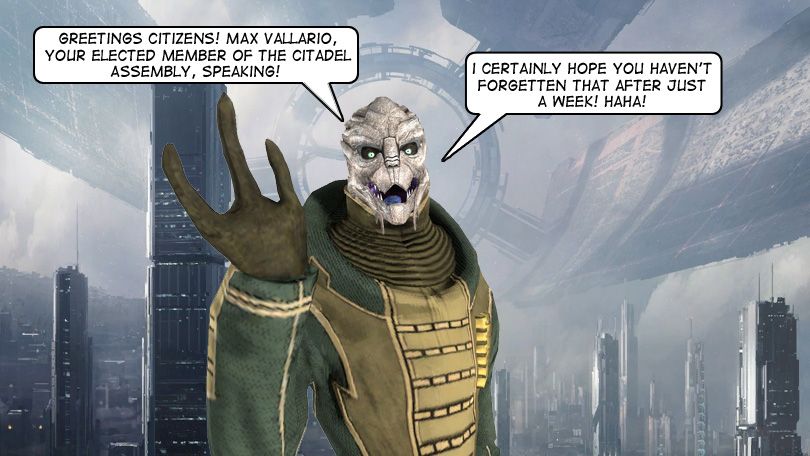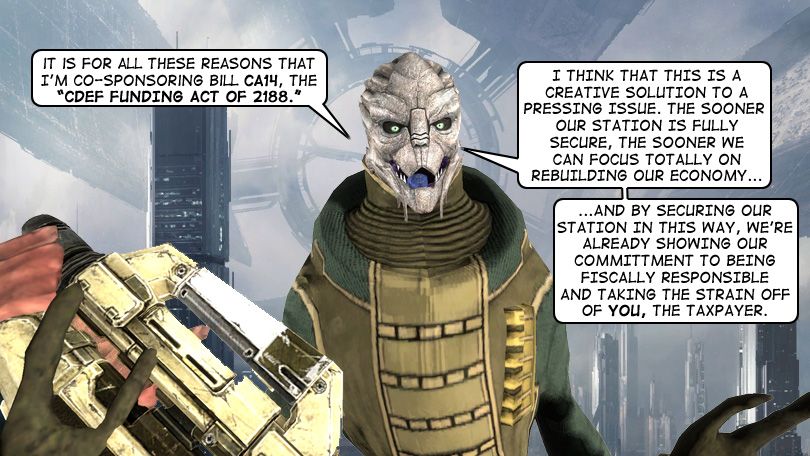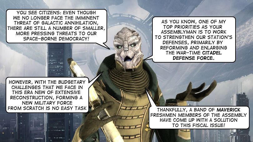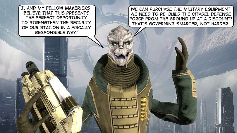 Admittedly, there aren't many less conspicuous ways to go about building your own personal army, so I suppose the assemblyman deserves some credit for managing to mask it so successfully under the guise of populism. You just know there are going to be enough idiots (most probably turian) who'll buy it- hook, line, sinker!