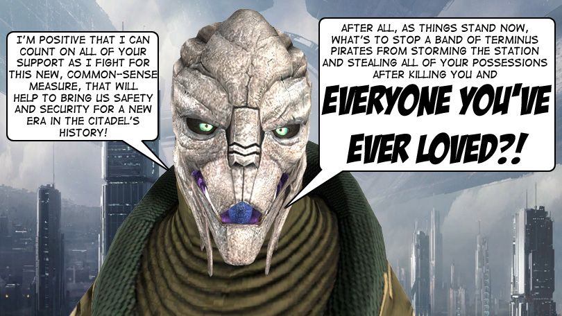 So why not put the gear funding towards C-Sec? Also, real nice, trying to use scare tactics like that. You know what's stopping Terminus pirates? The Citadel Fleet. And the Alliance. And C-Sec. And... This is why I still don't get this obsession with democracy. |